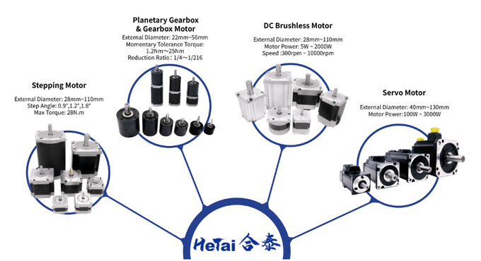 Hetai’s main products are Brushless dc motor, Hybrid Stepper motor, Planetary gearbox, Servo motor.